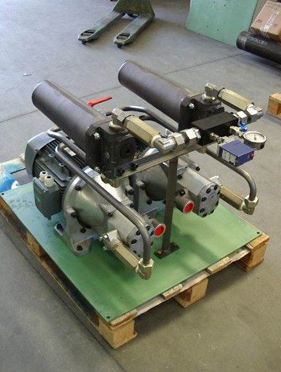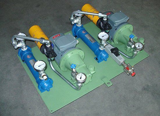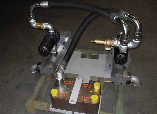 Gruppo doppio di raffreddamento olio riduttore comando estrusore plastica Pompa ad ingranaggi, flussostati e scambiatore di calore ad acqua. Filtro in mandata da 25 micron.